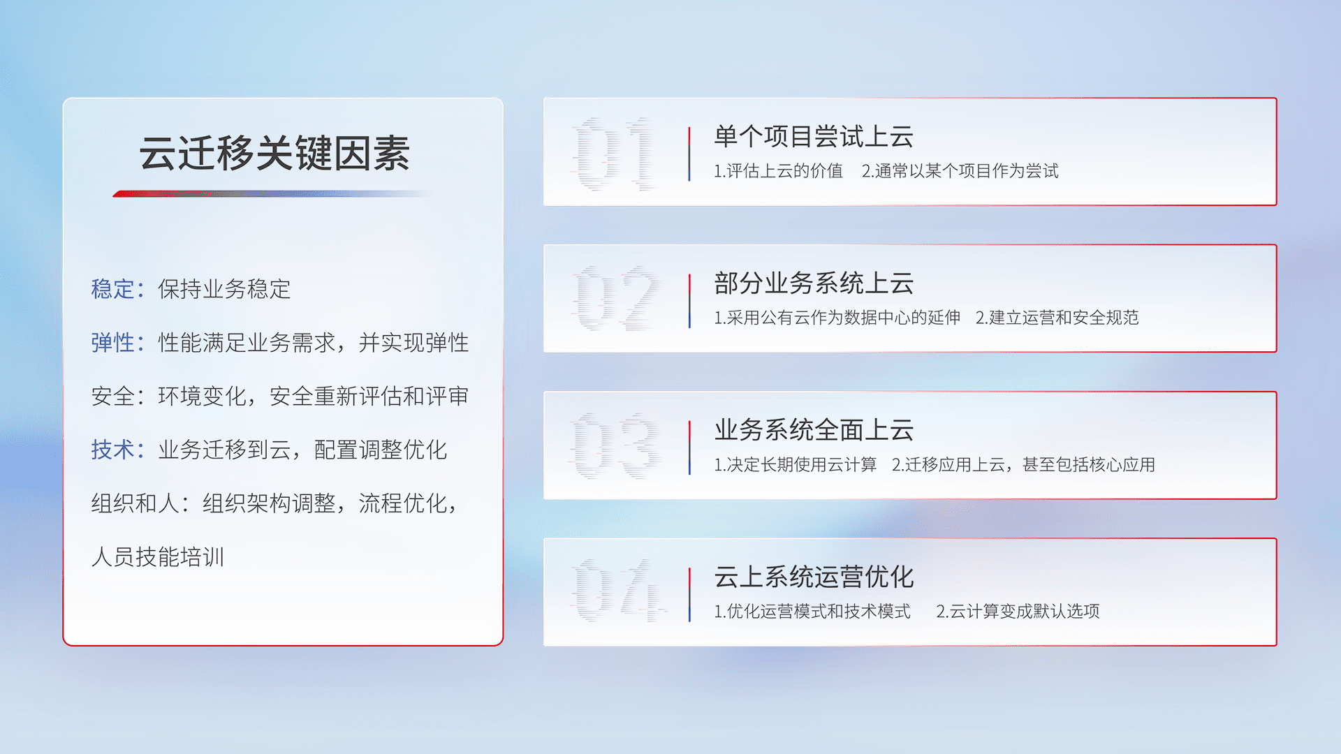 结合实际业务,,从规划设计、、云平台选型、、、、云原生改造、、数据迁移、、、集成交付,,迁移全过程为客户识别最佳上云路径,,,,做好风险识别管理,,,设计网络架构、、、身份权限、、、、安全审计合规、、、操作审计、、日志审计、、、监控告警策略、、、、多站点容灾设计等,,,,对云上基础设施进行整体规划,,,提升IT治理水平,,以满足弹性、、、高可用、、、、高性能的需求。。。。